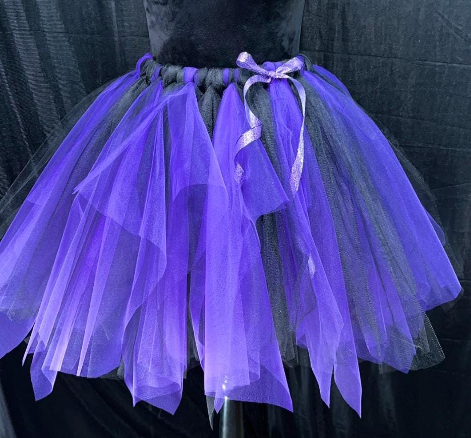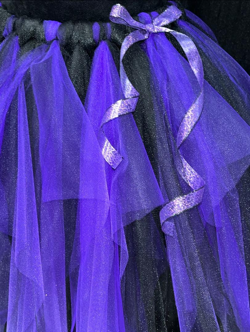 This purple and black pointed cut tutus is just in time for Halloween .. great for dancing , cheering or just to play dress up! Handmade from 100% Polyester materials . Soft, Comfortable satin covered elastic Waistband . Very vibrant colors, Lightweight and fun to wear.