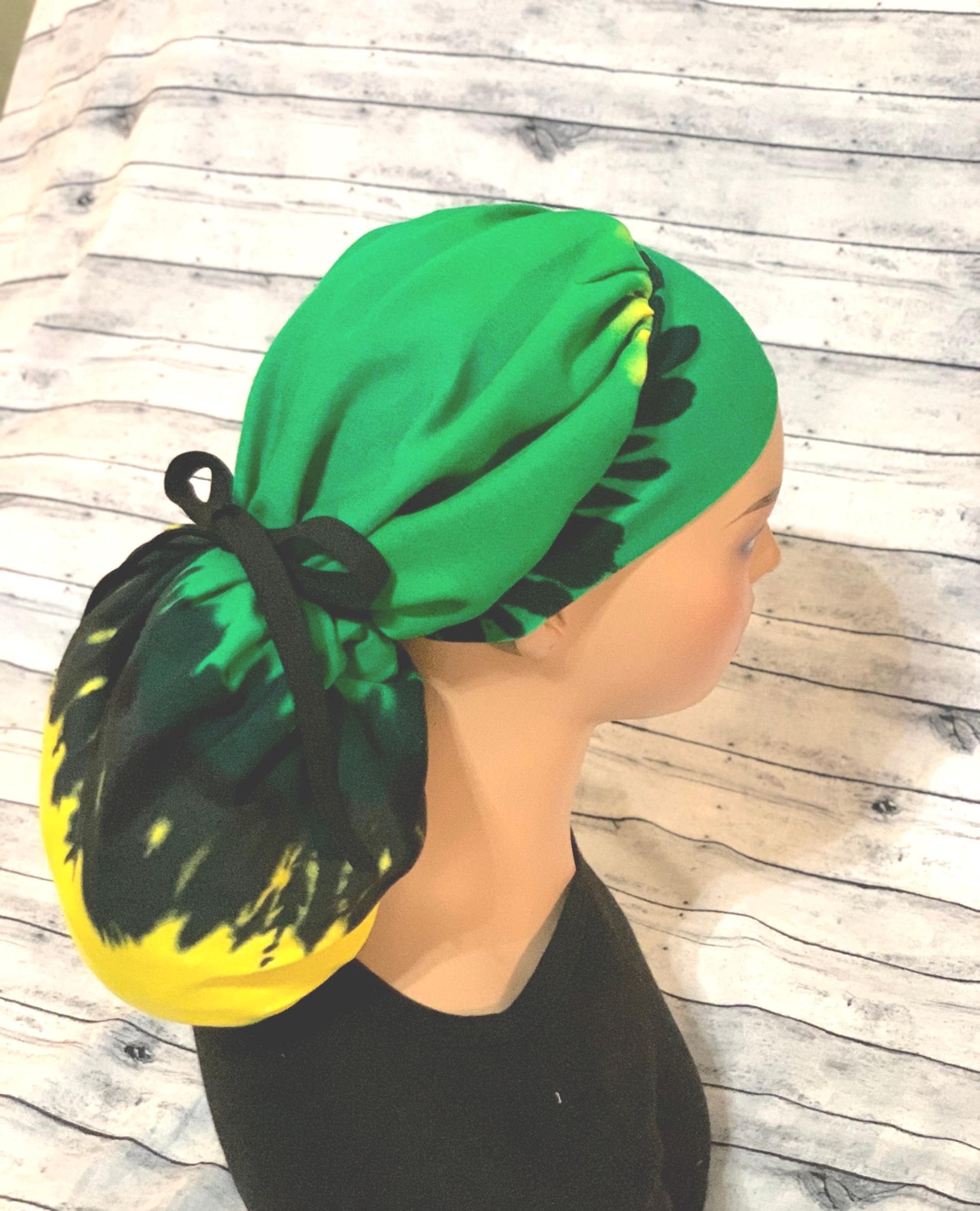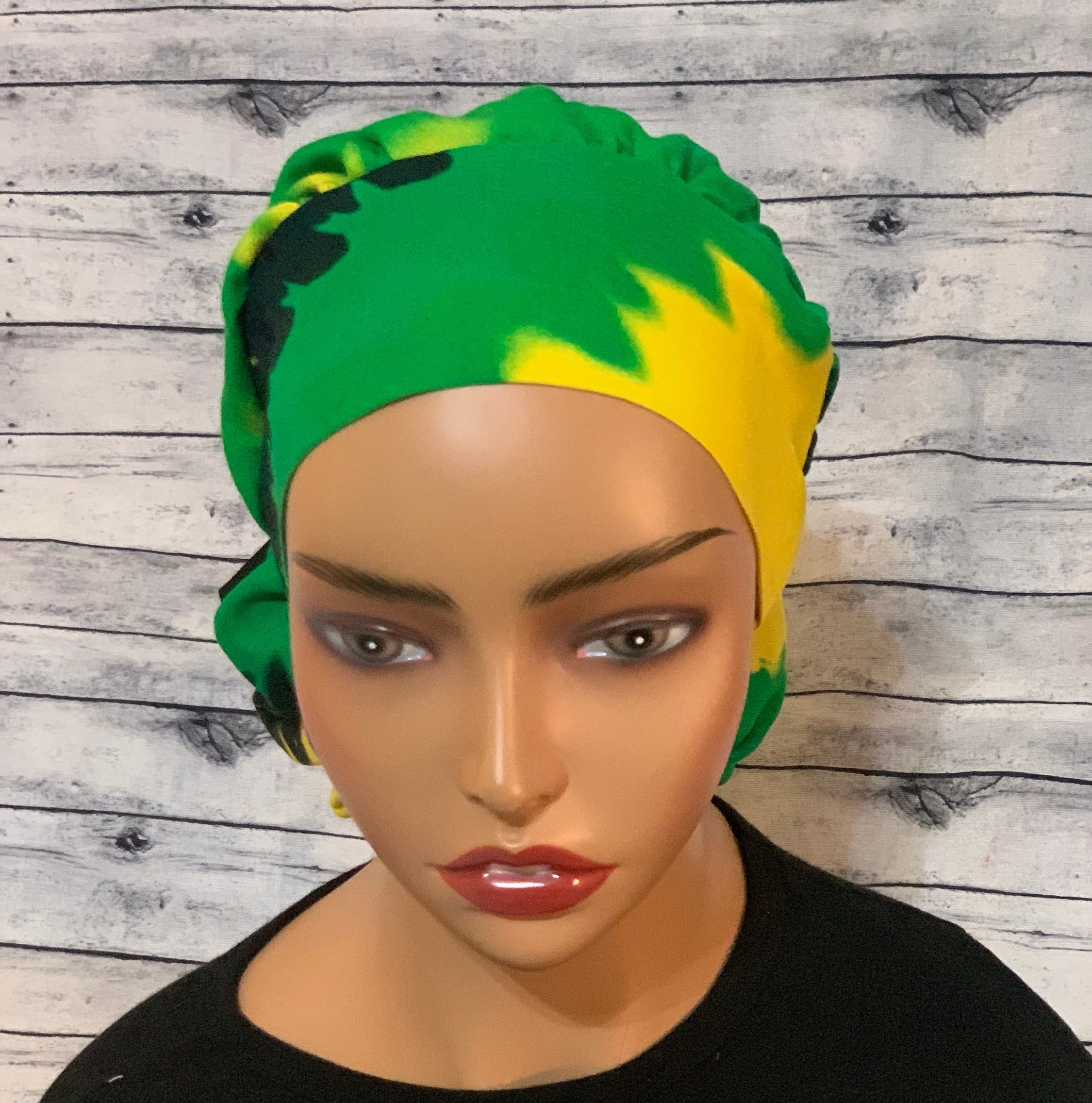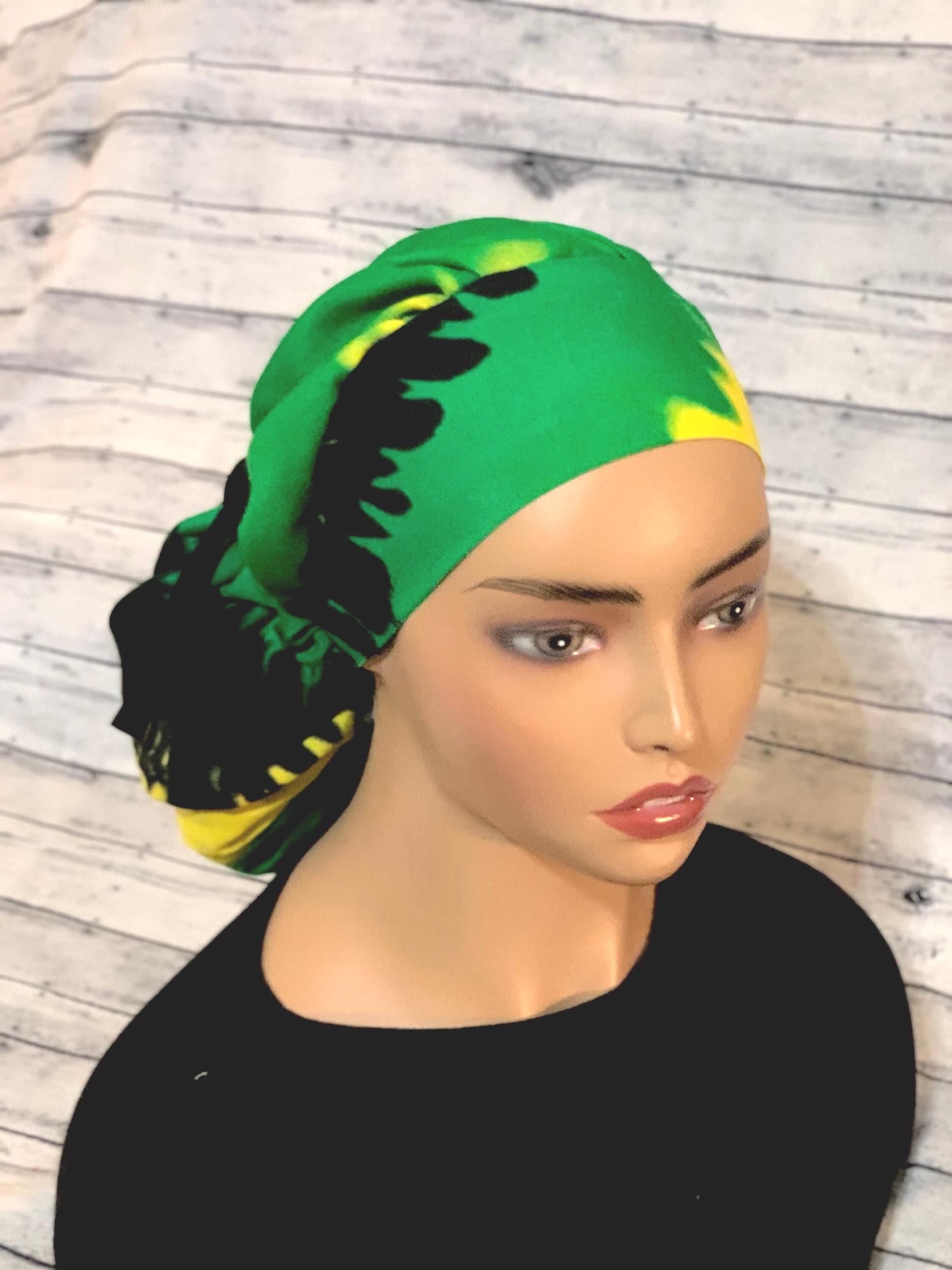This Jamaican / African print ponytail Bouffant Scrub Caps is made from %100 high quality Rayon material and lining. It comes with 18”inch back tie and large back pouch. Made to accommodate any trendy hairstyle . Great for dreadlocks Rasta as well. One size fits all adults. IRIE!!