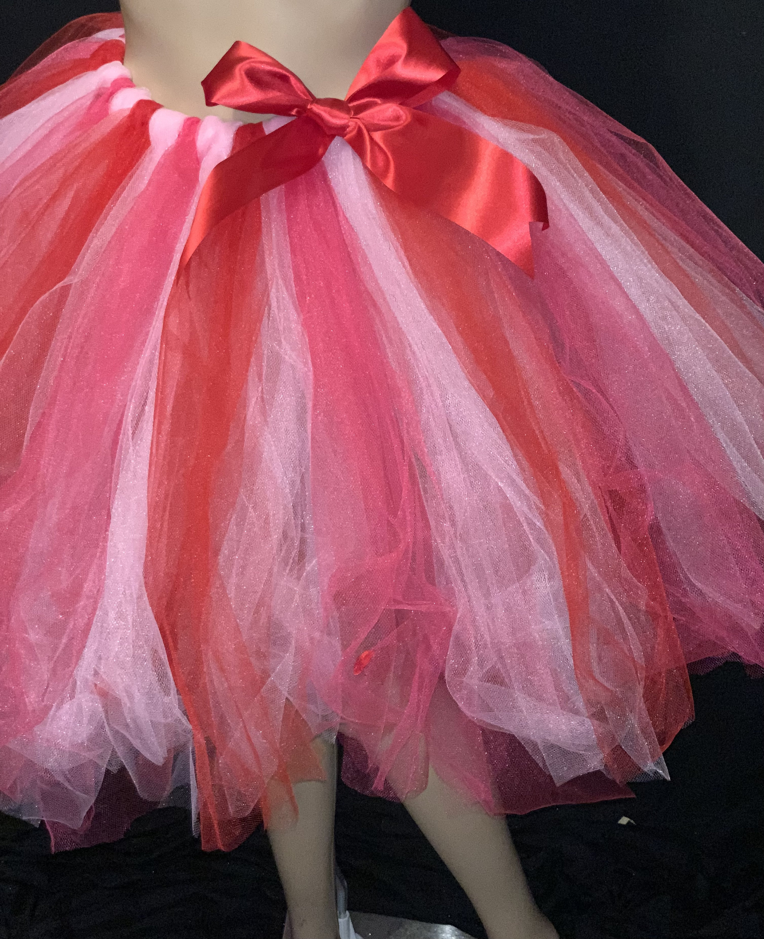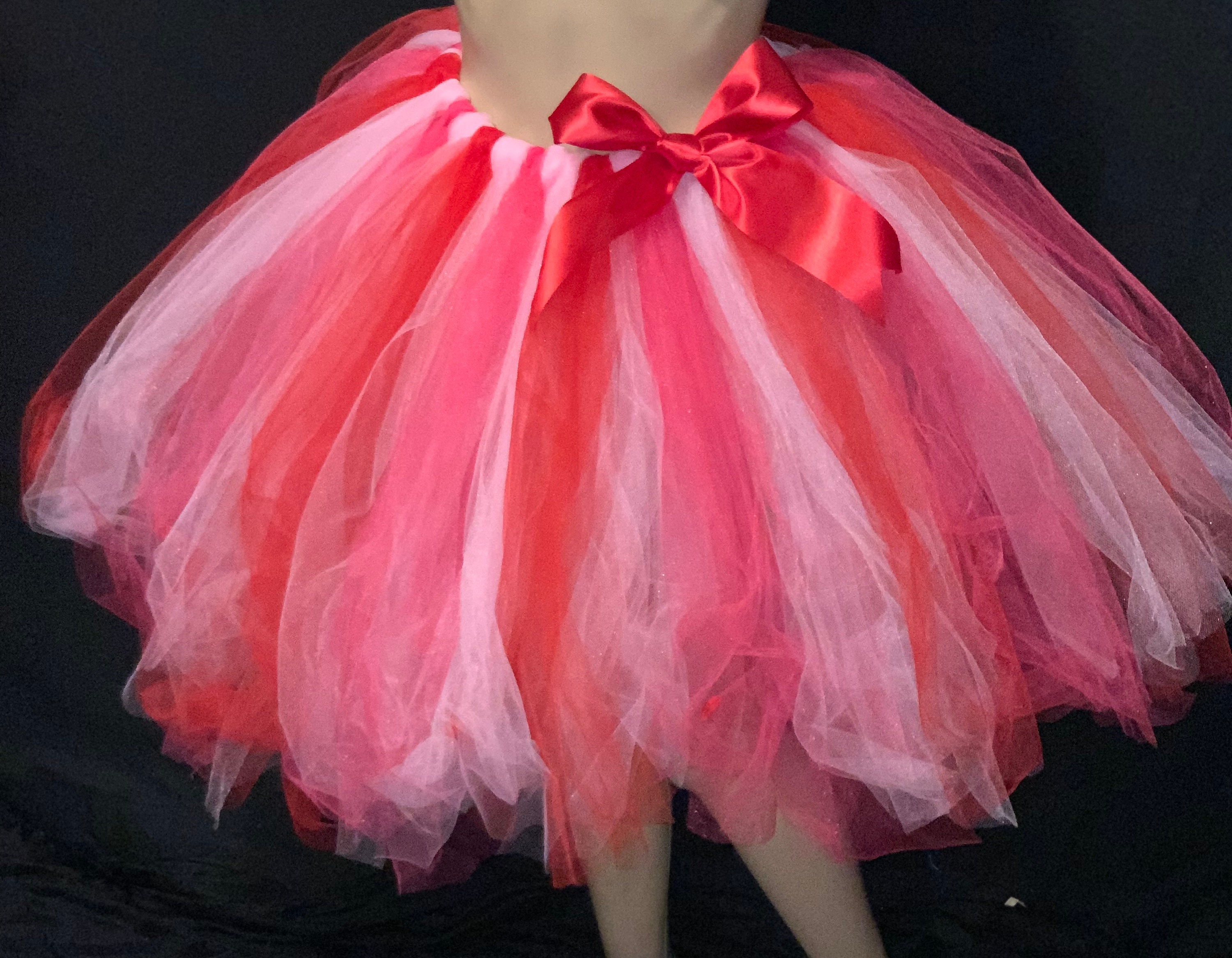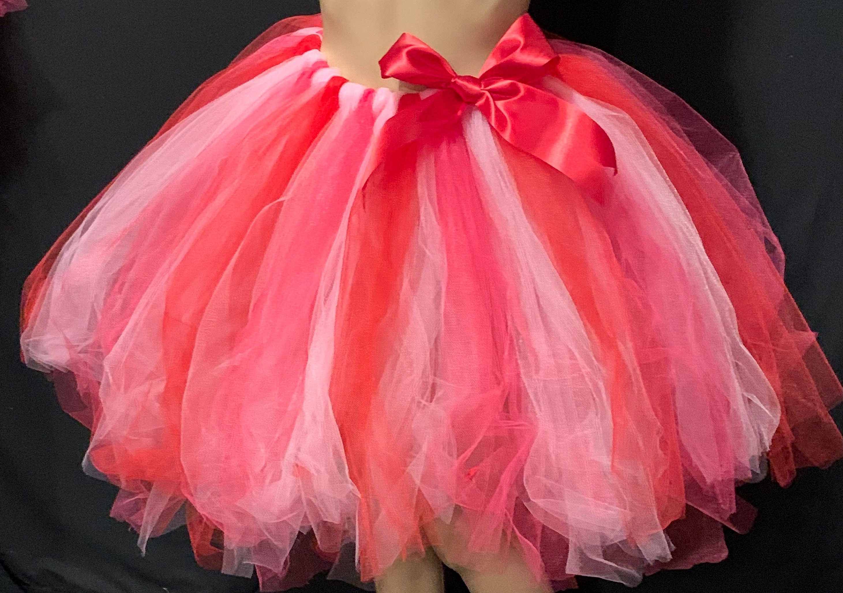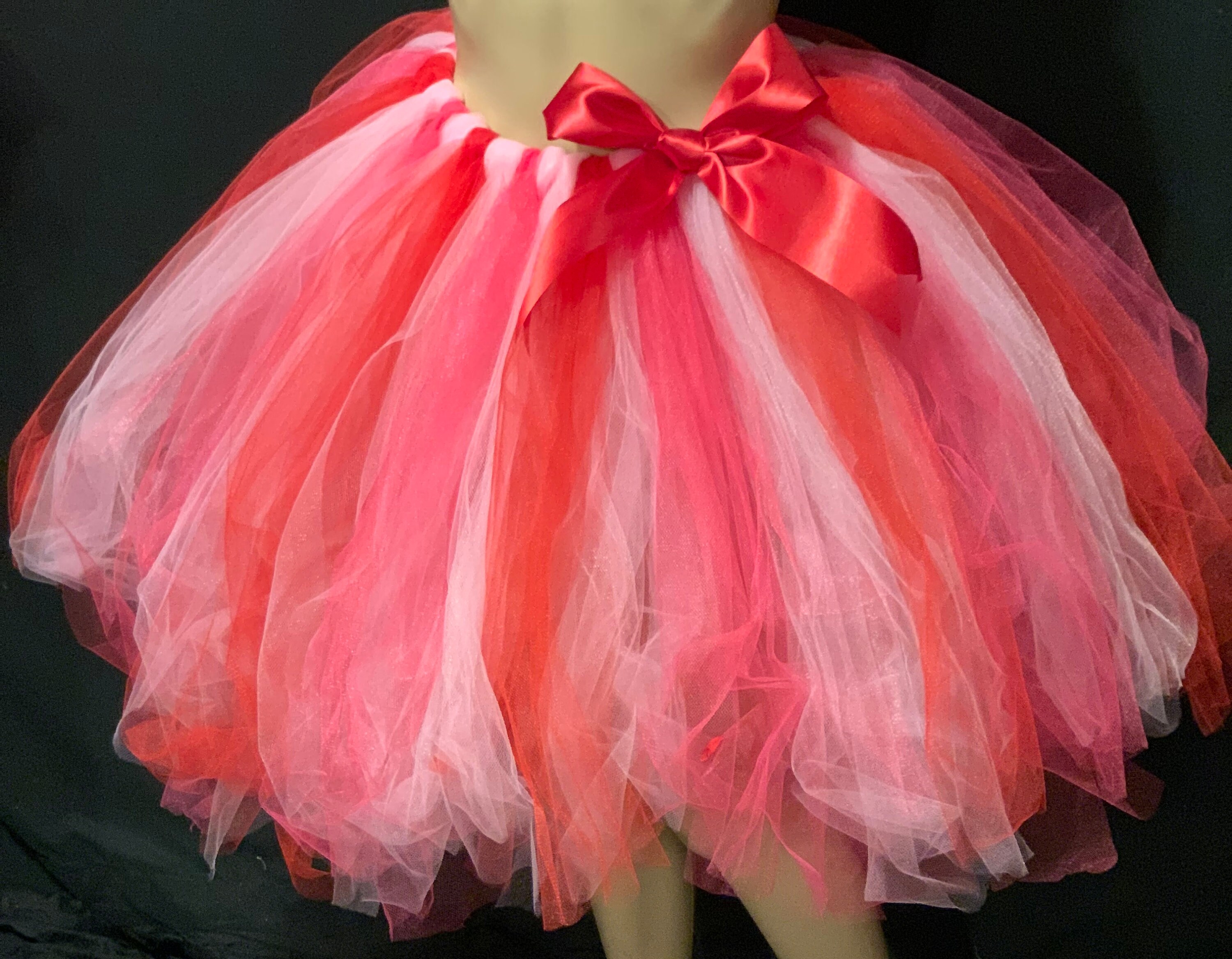 This soft and fluffy extra puffy red, light pink and Fuchsia pink combination tutus is great for Valentine parties and more. Comes in several sizes. Handmade from 100% Polyester materials with a comfortable 1 inch satin covered elastic waistband !