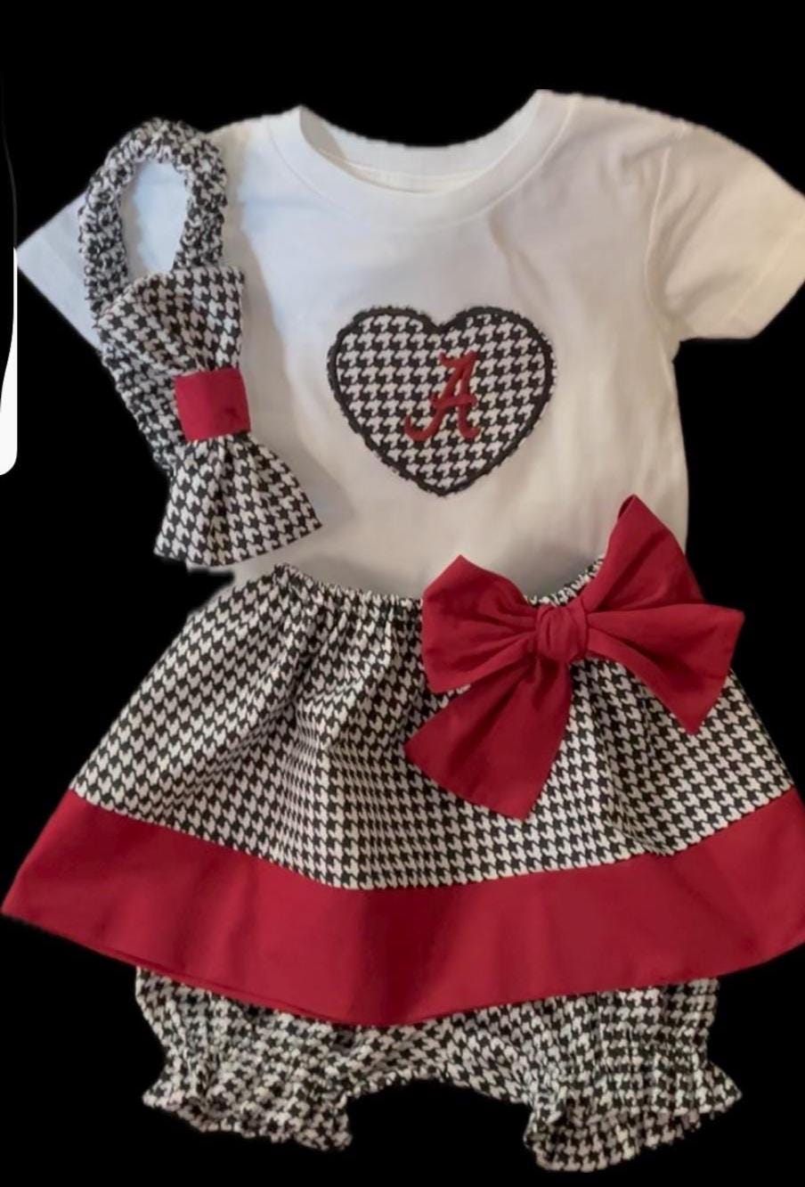 Taking your little one to the game? Why not let her sport this adorable houndstooth and Crimson red skirt with matching bloomers , sure to add a beautiful touch to any little girls clothing collection. This listing includes a skirt with matching bloomers. Uniquely made. Perfect for everyday wear.or to show your team spirit , available in several children sizes . %100 cotton material. Questions ?please do not hesitate to message winsome by depositing a note in the message box provided. Thanks