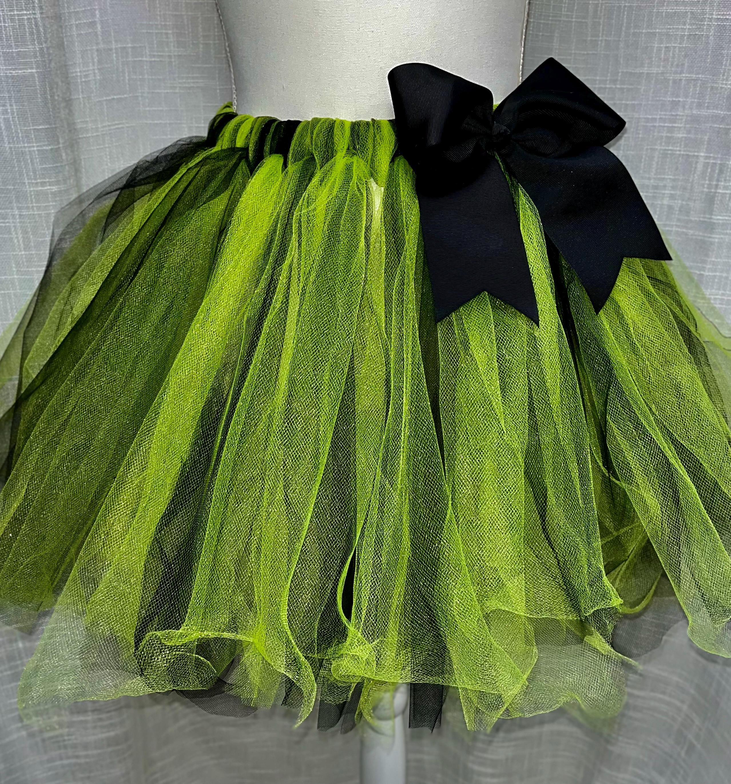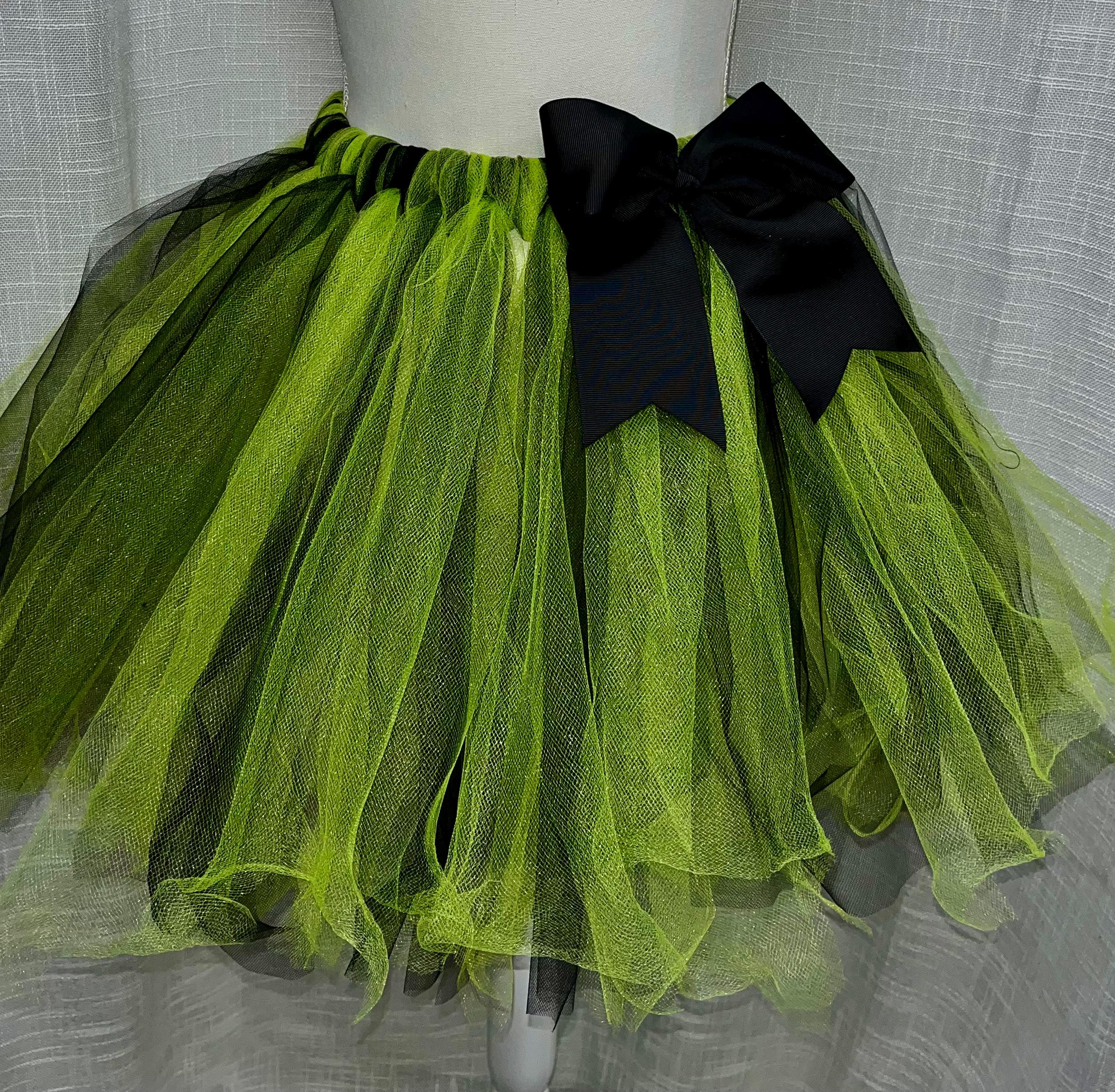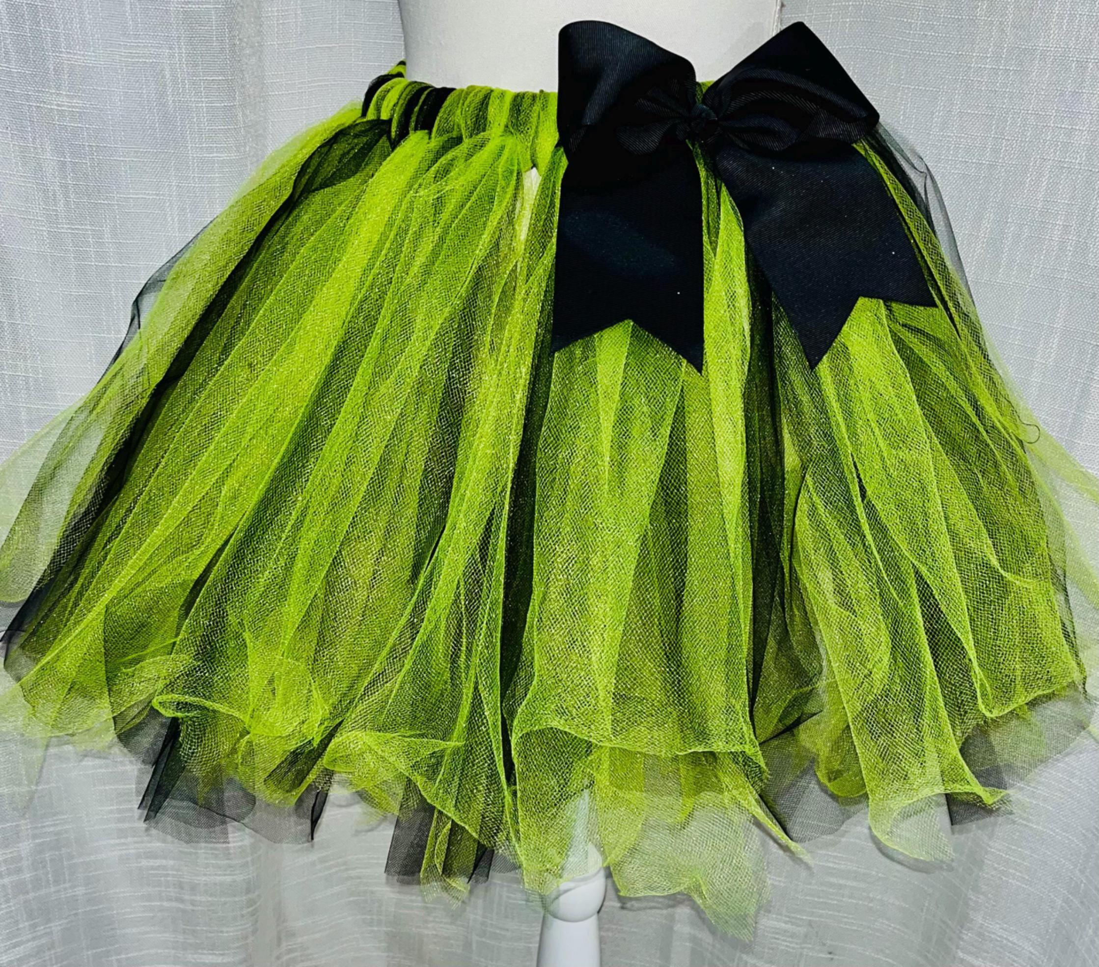This adorable bright green with black undertones Holiday children tutu is handmade with the holiday season in mind. Well crafted and embellished with an X-Large black bow. handmade from %100 polyester Tulle fabric material . Comfortable 1 inch satin covered elastic waistband . Great for all your holiday festivities.
