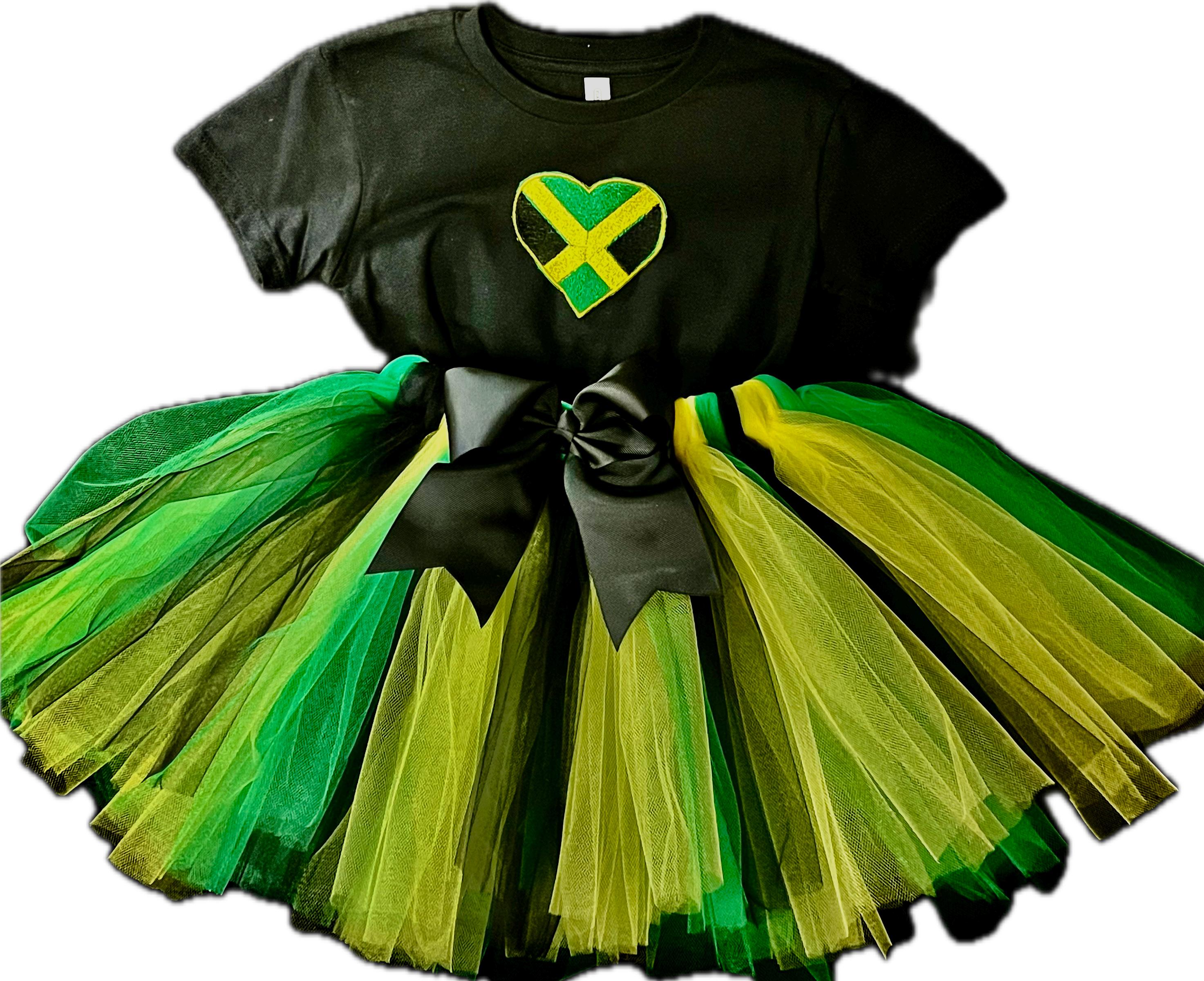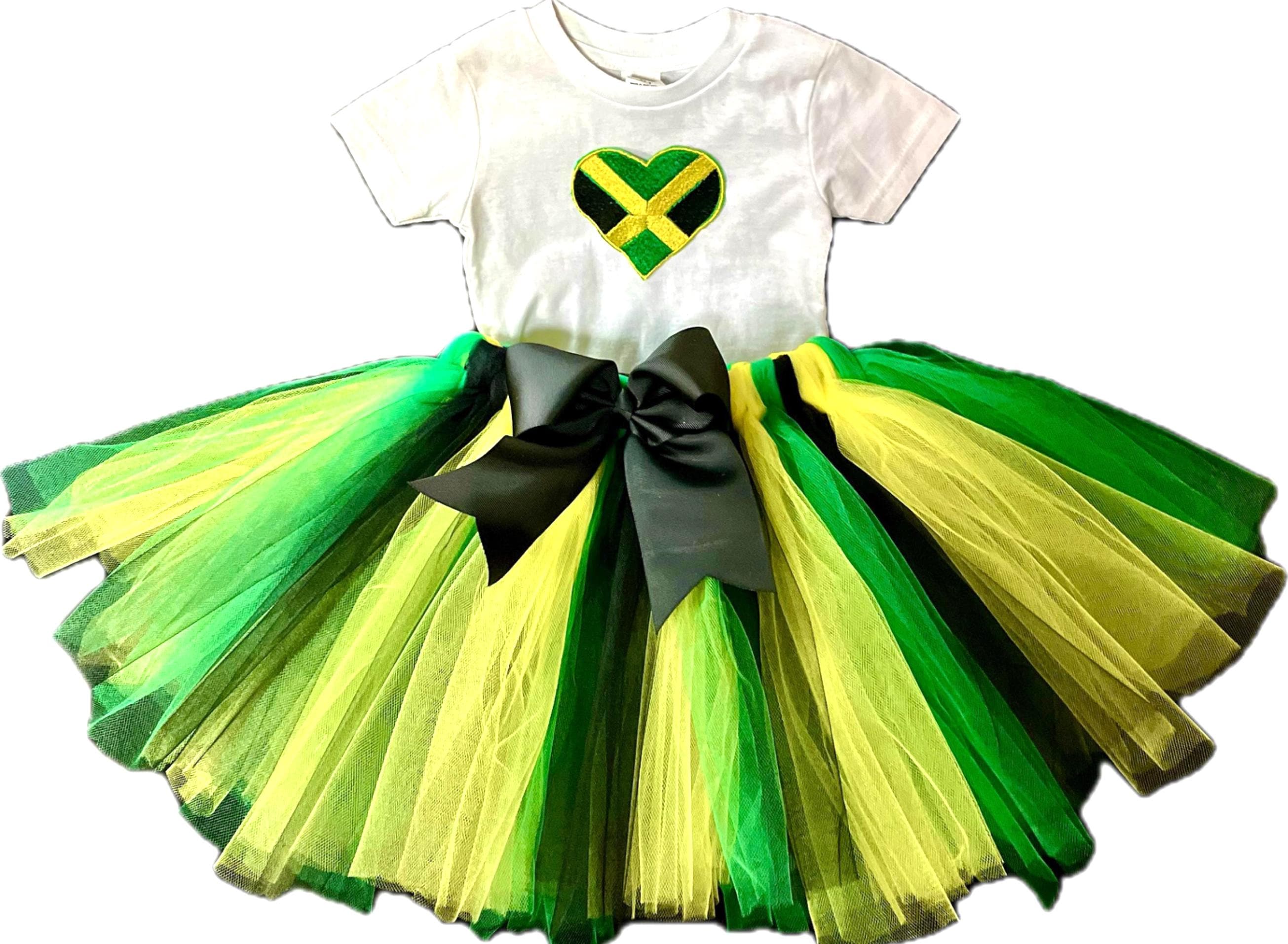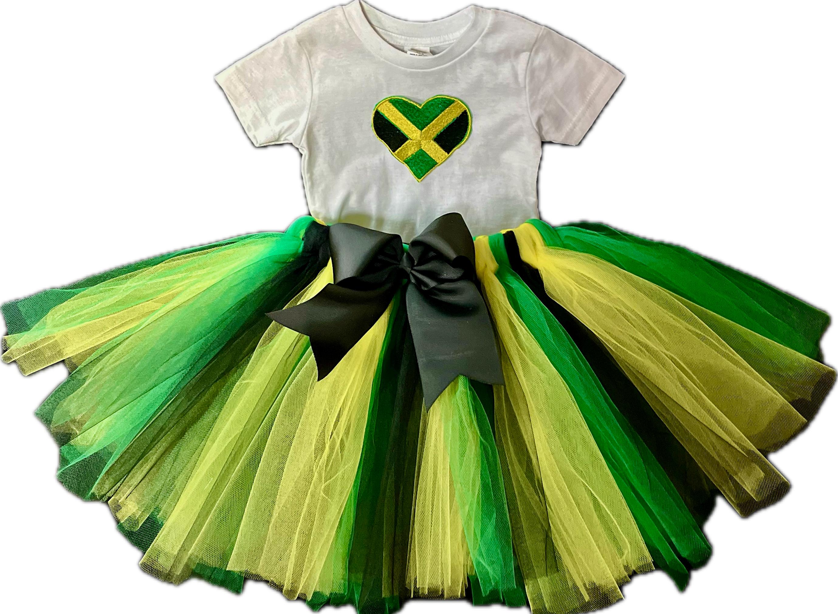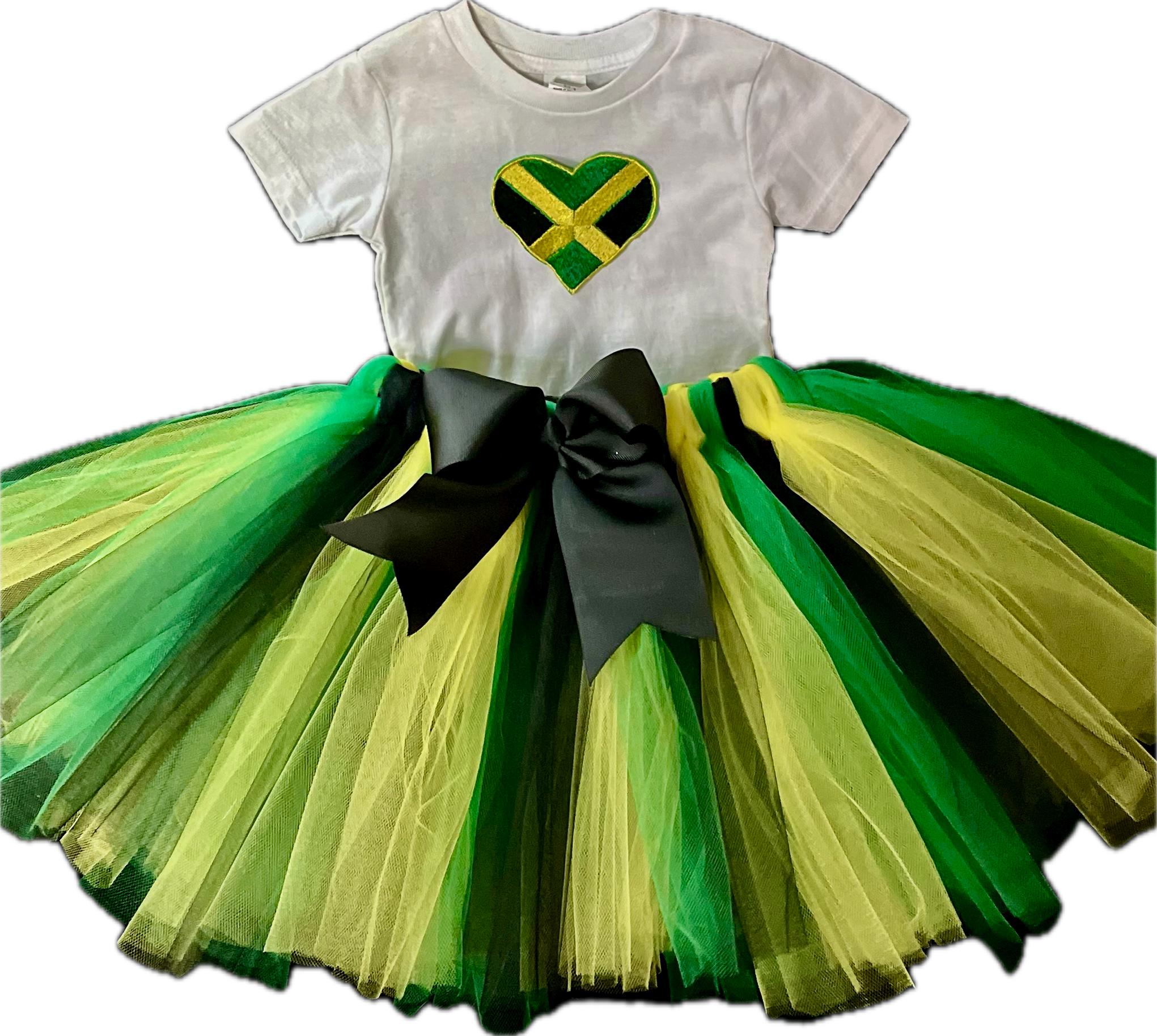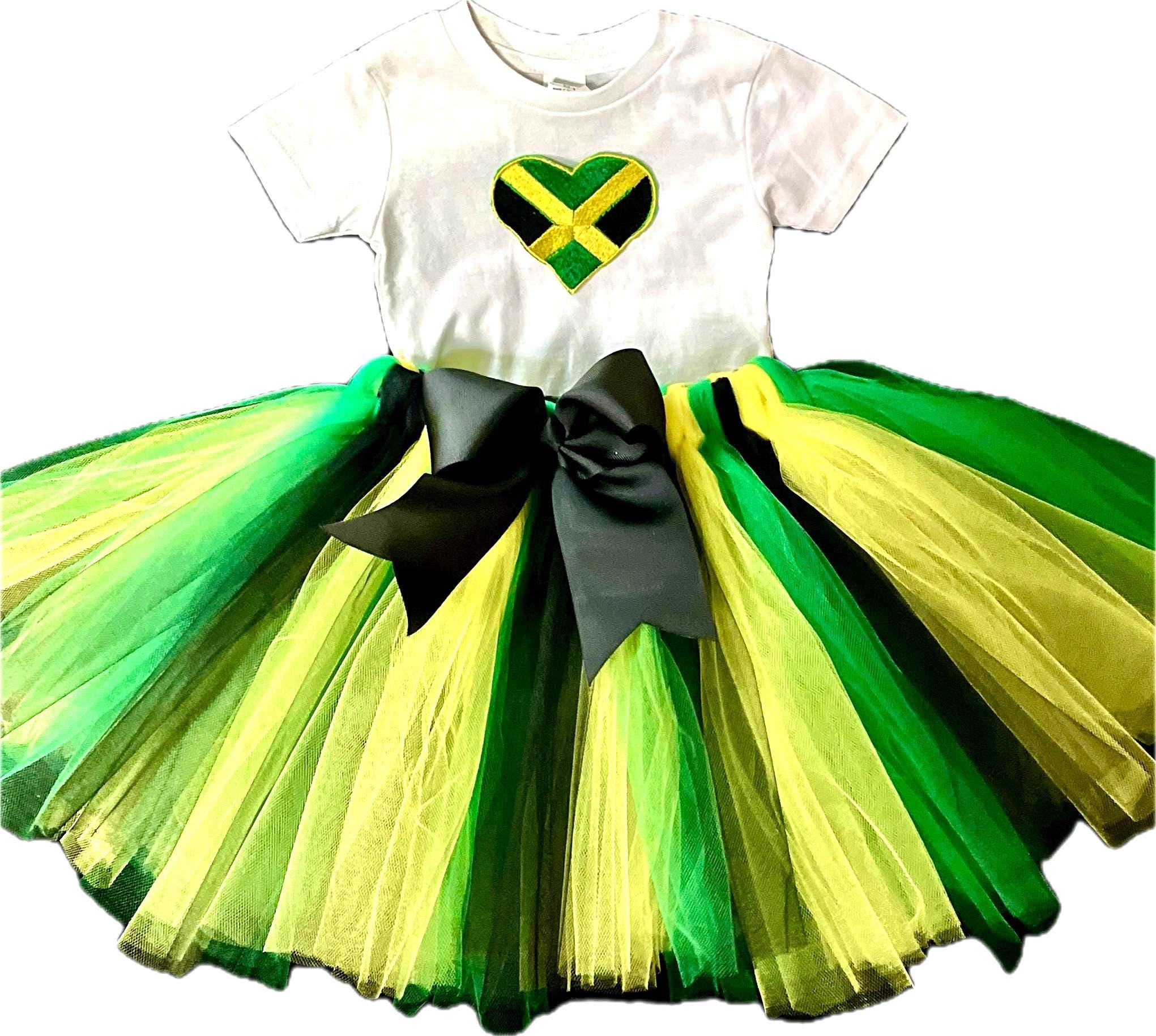 These adorable black, green red yellow and white color Jamaican’s flag color scheme tutu set includes a lovely tutu to match T shirts are , embroidered a black , green and yellow heart to last for years ! Great for many different festivities or for everyday wear, parties, vacationing , Jamaica’s Independence Day celebrations and so much more! This Jamaican flag color themed inspired tutu set was handmade from 100% Polyester tulle fabric material and 1” satin cover elastic waist band. Lightweight and well crafted . Should be Worn with Leggings or tights for added coverage Tutu is available in your favorite choice of colors as well at no additional costs to you!, please leave me a note in the message box below after your purchase, thanks.