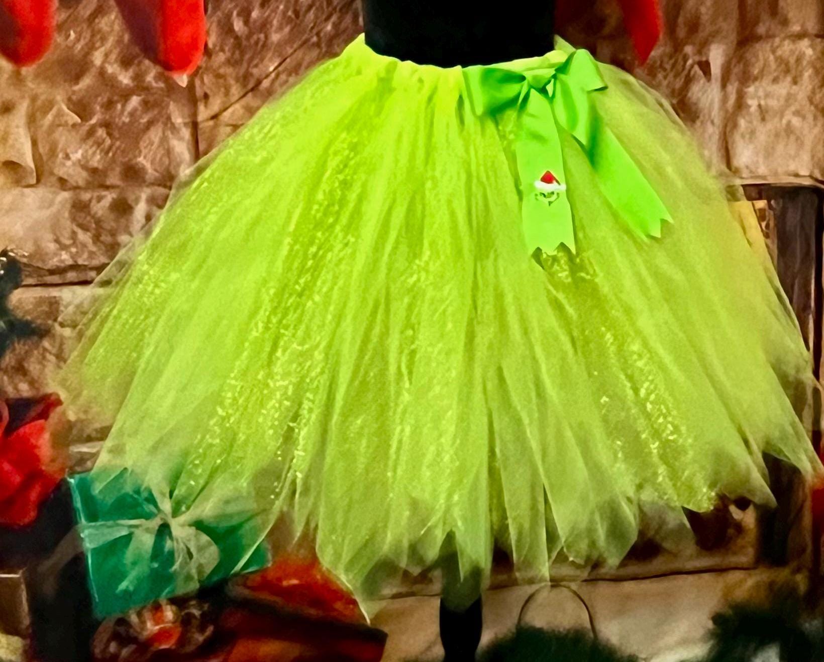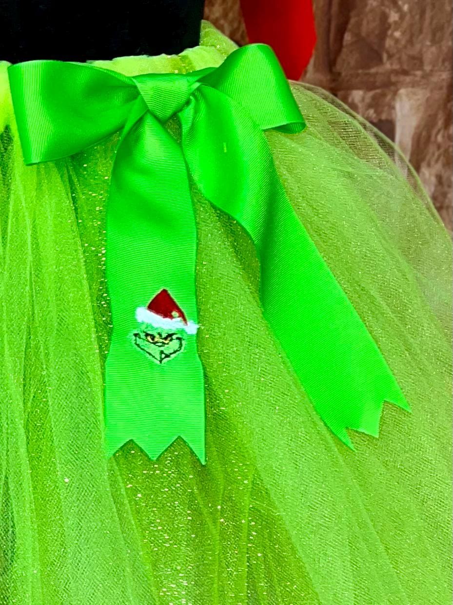 Grinchmas children sparkling holiday costume tutu embellished with an embroidered green color bow pixie cut Mr Grinch tutu