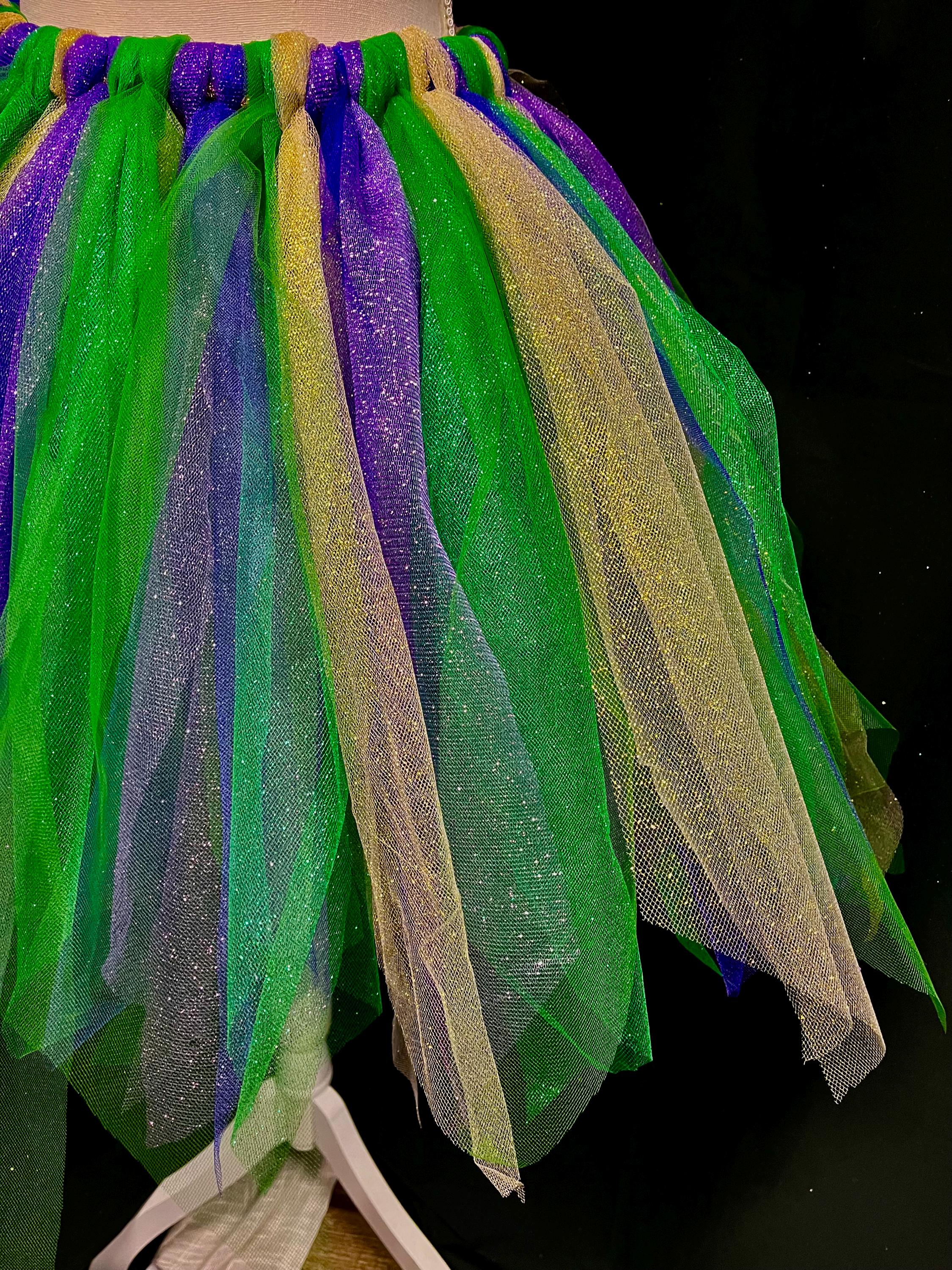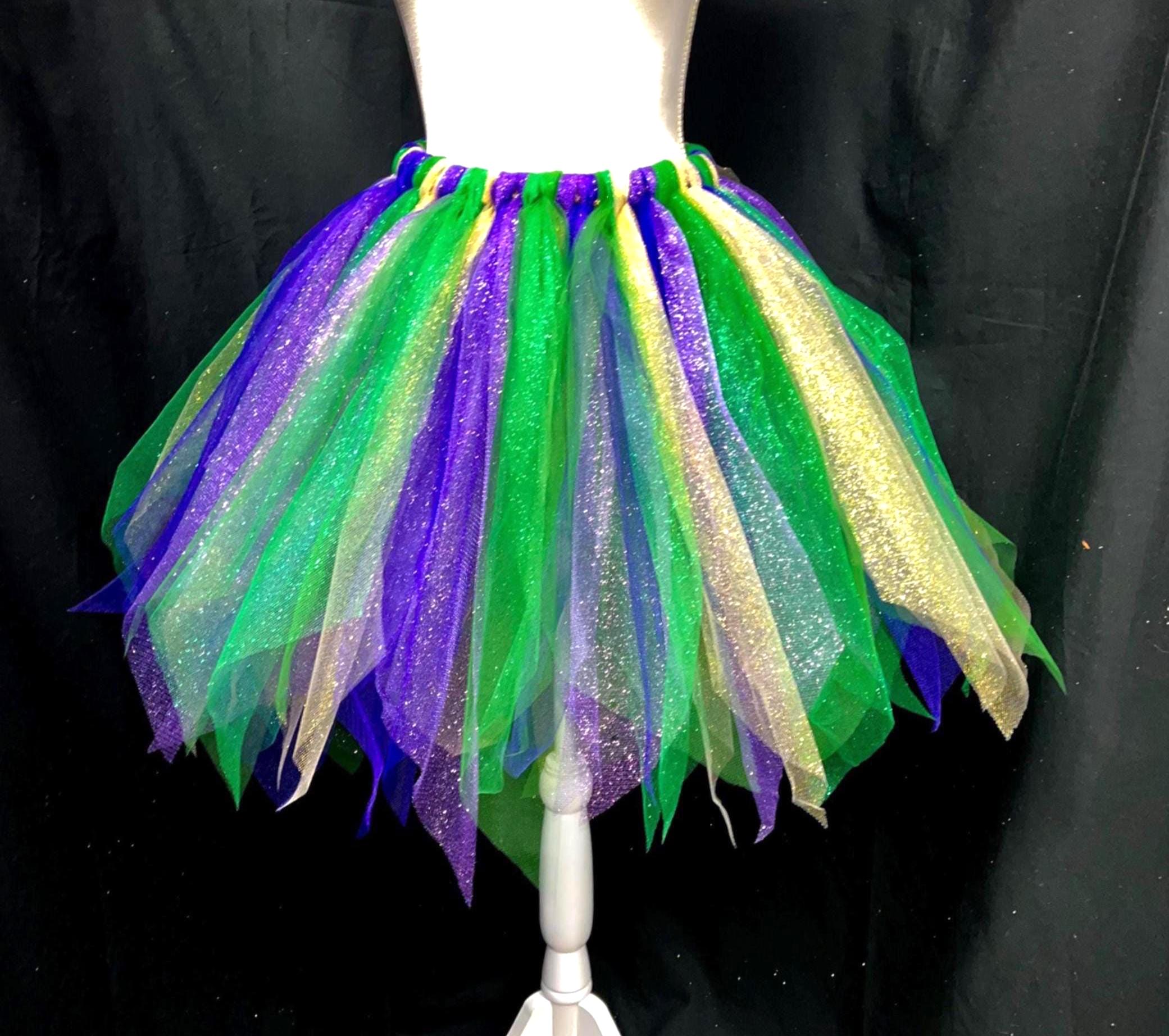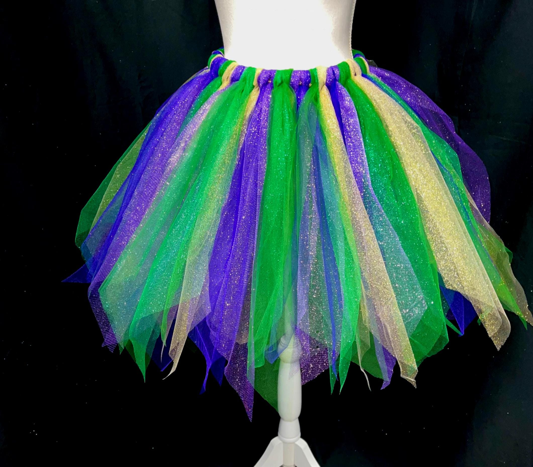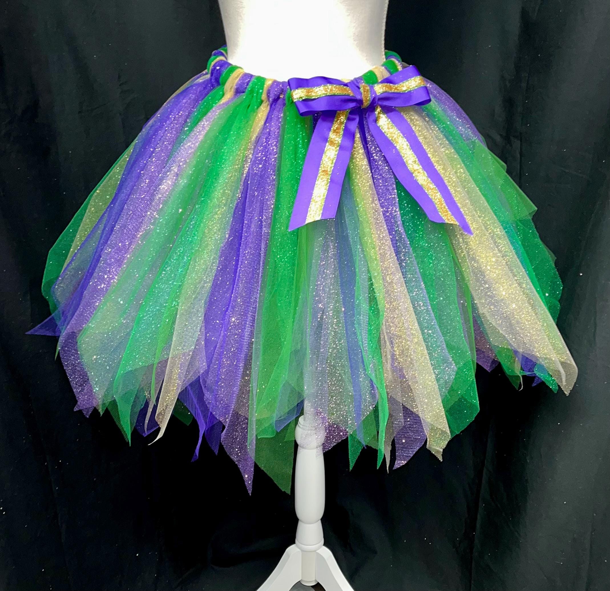 Yes , let the party begin with this adorable sparkly pointed cut , purple, green , and gold color tutu. Extra full . This Mardi Gras adult and teens tutus is Handmade from 100% Polyester fabric materials . Soft Comfortable 1 inch elastic waistband. Comes with a beautiful Matching bow, Lightweight and fun to wear.! You can request to rearrange colors to your liking as well. Leave a message for the seller in the message box included . Thanks in advance for your support!