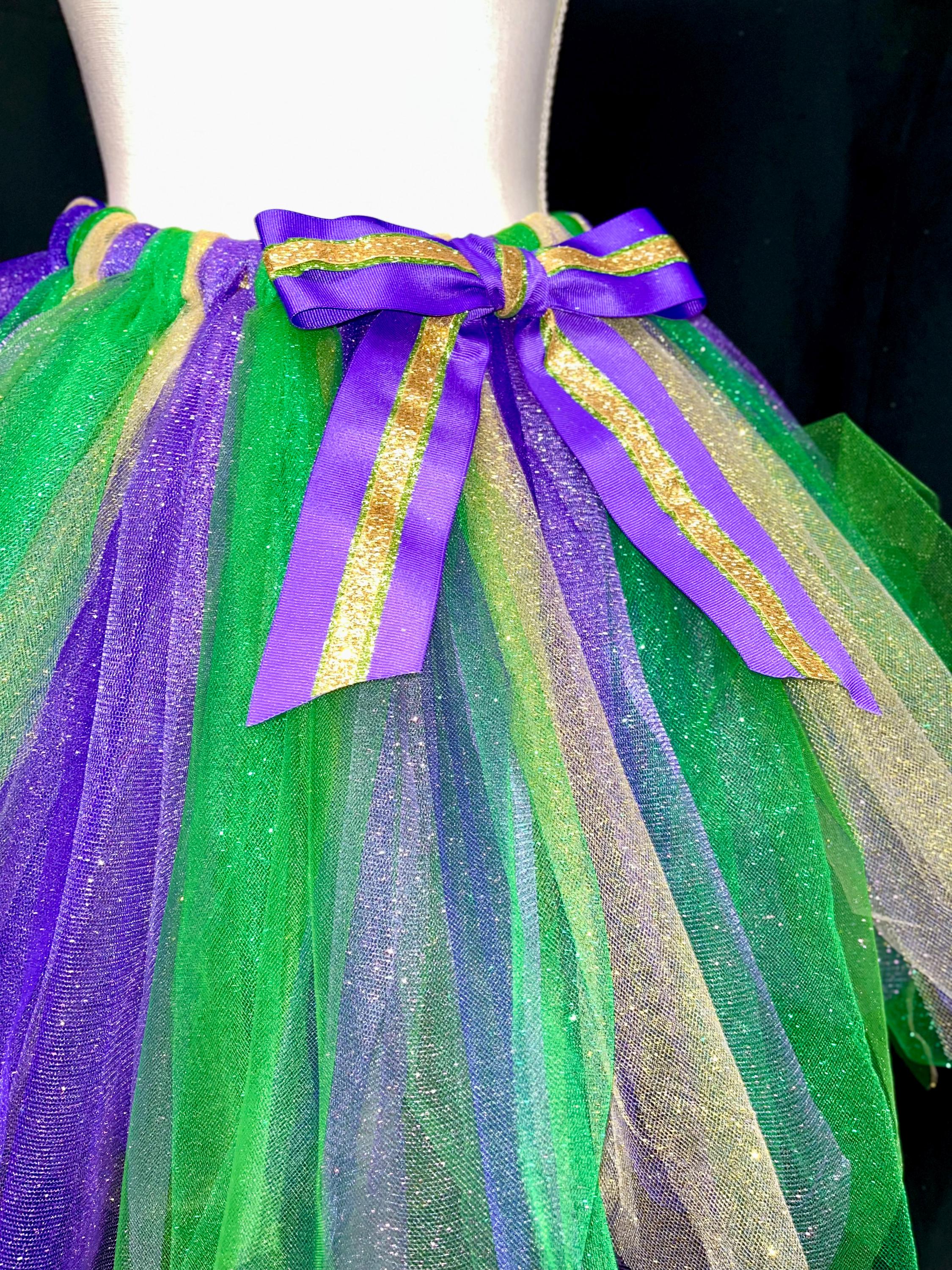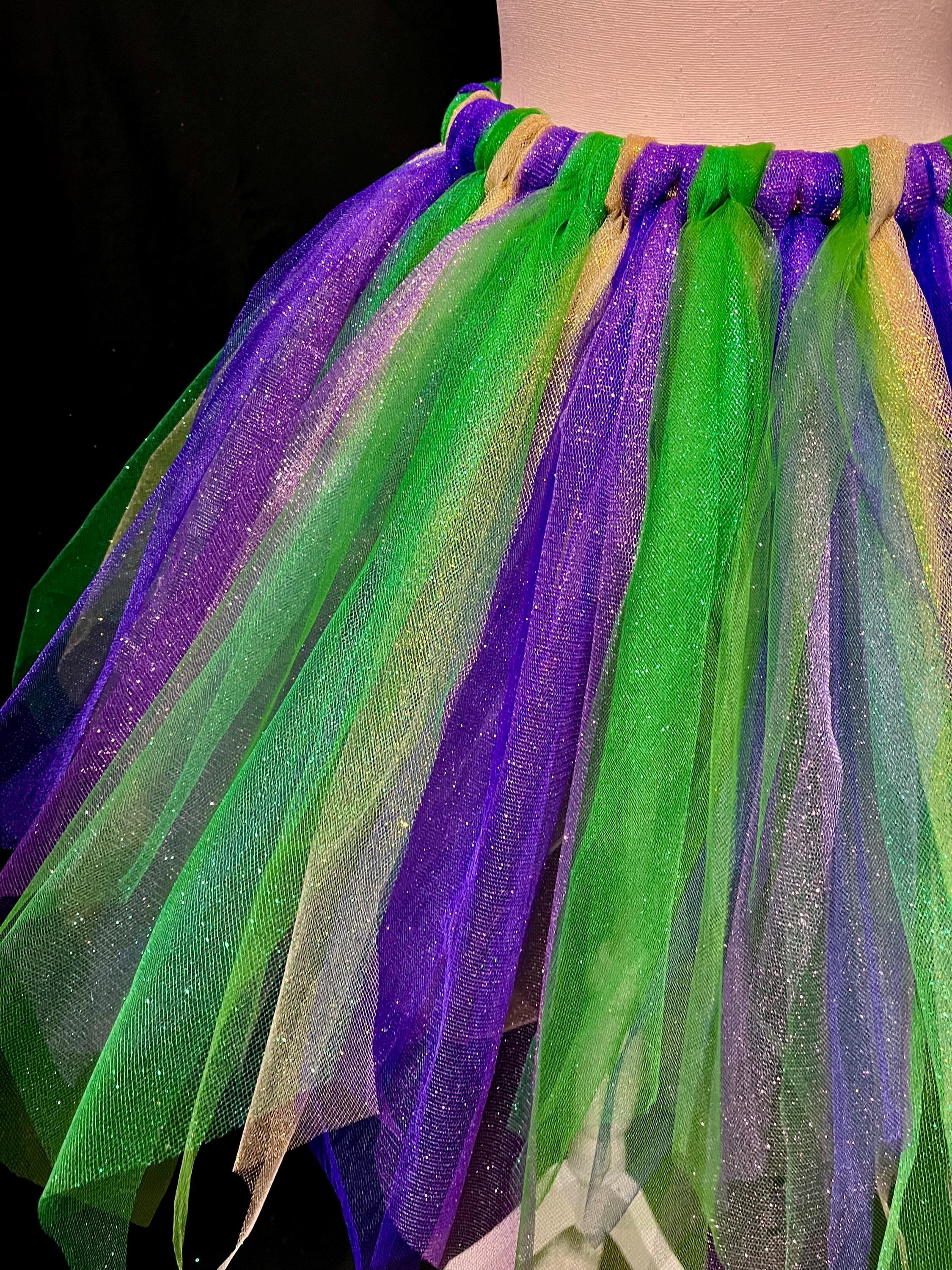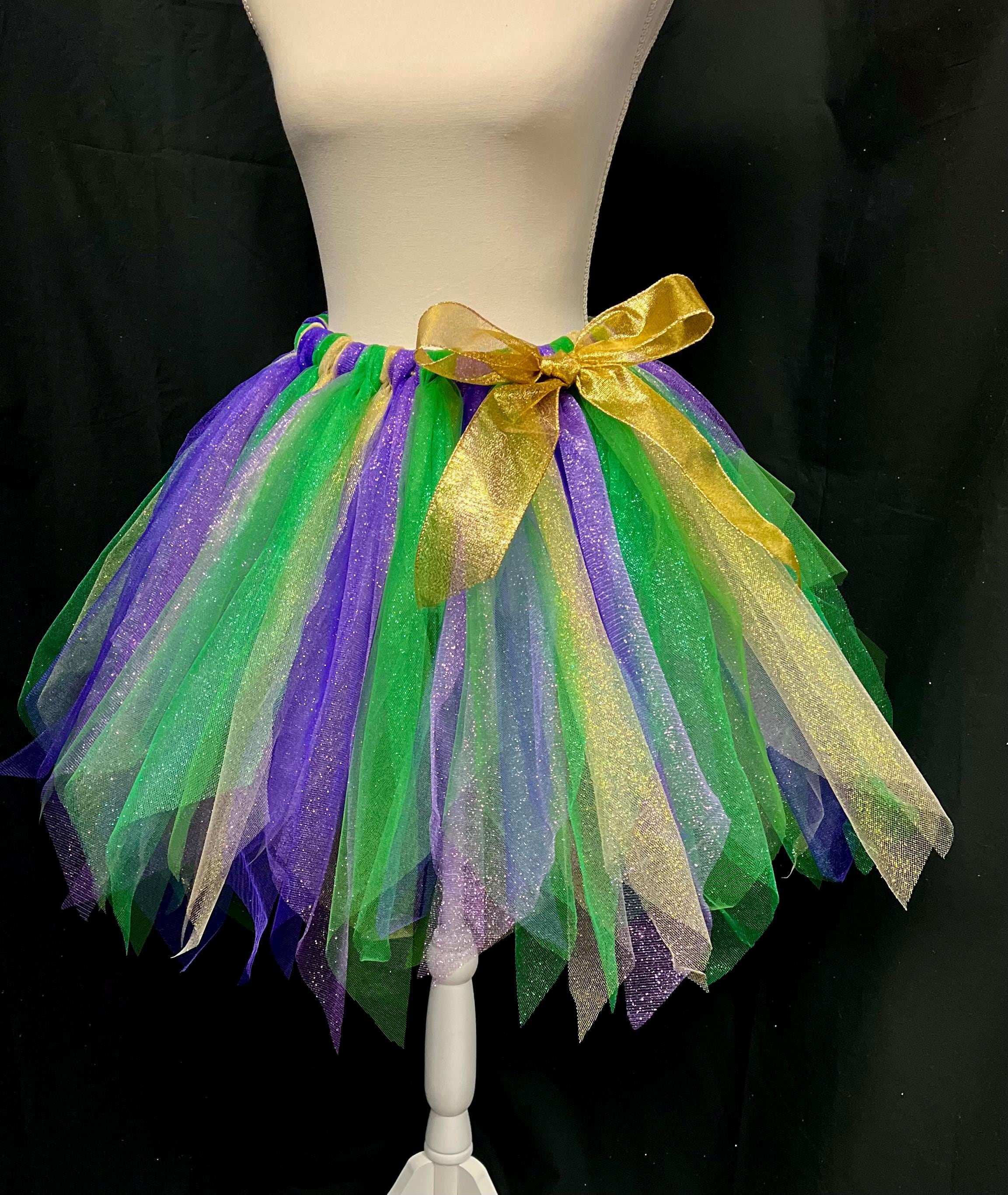 Yes , let the party begin with this adorable sparkly pointed cut , purple, green , and gold color tutu. Extra full . This Mardi Gras adult and teens tutus is Handmade from 100% Polyester fabric materials . Soft Comfortable 1 inch elastic waistband. Comes with a beautiful Matching bow, Lightweight and fun to wear.! You can request to rearrange colors to your liking as well. Leave a message for the seller in the message box included . Thanks in advance for your support!