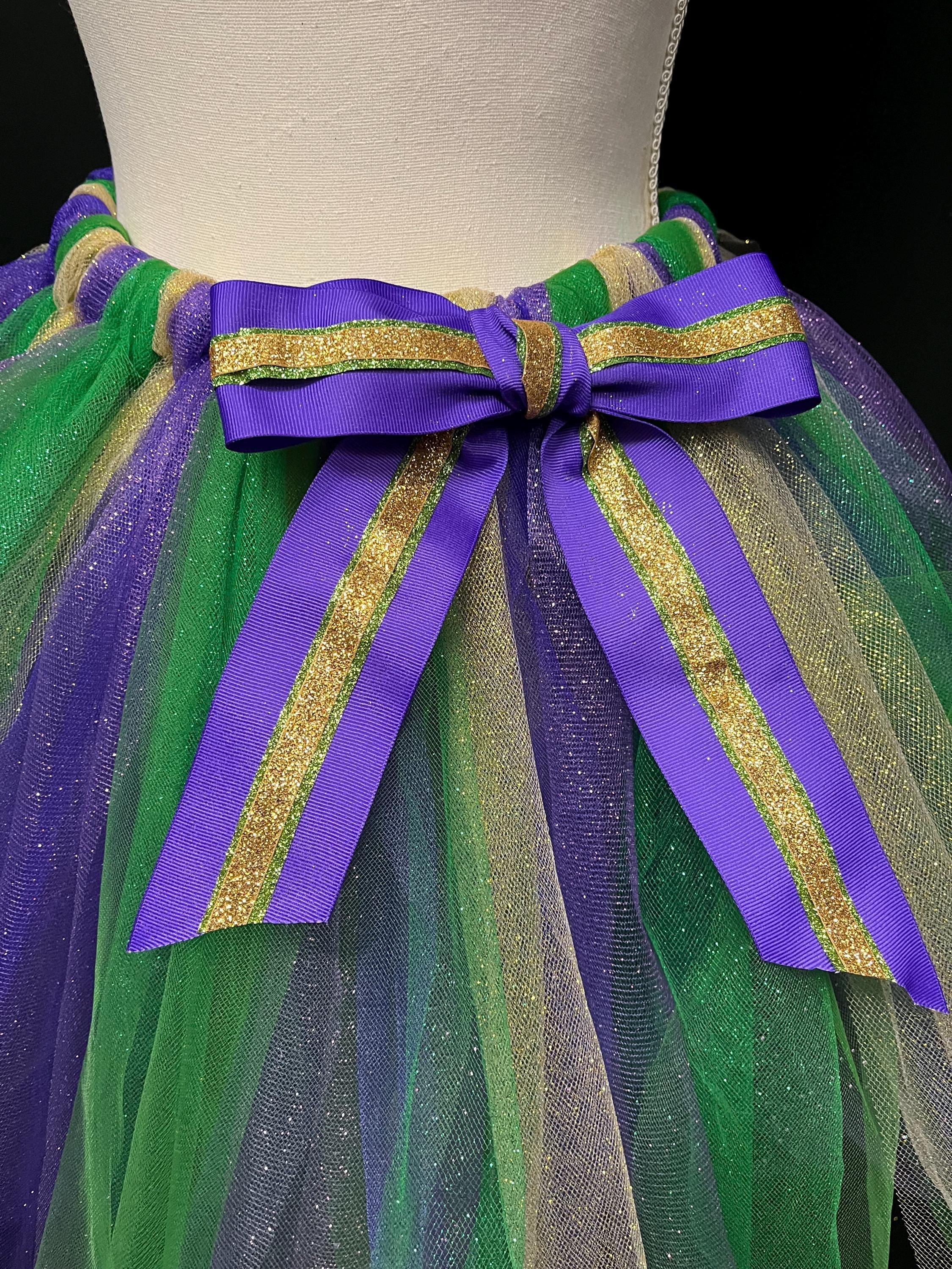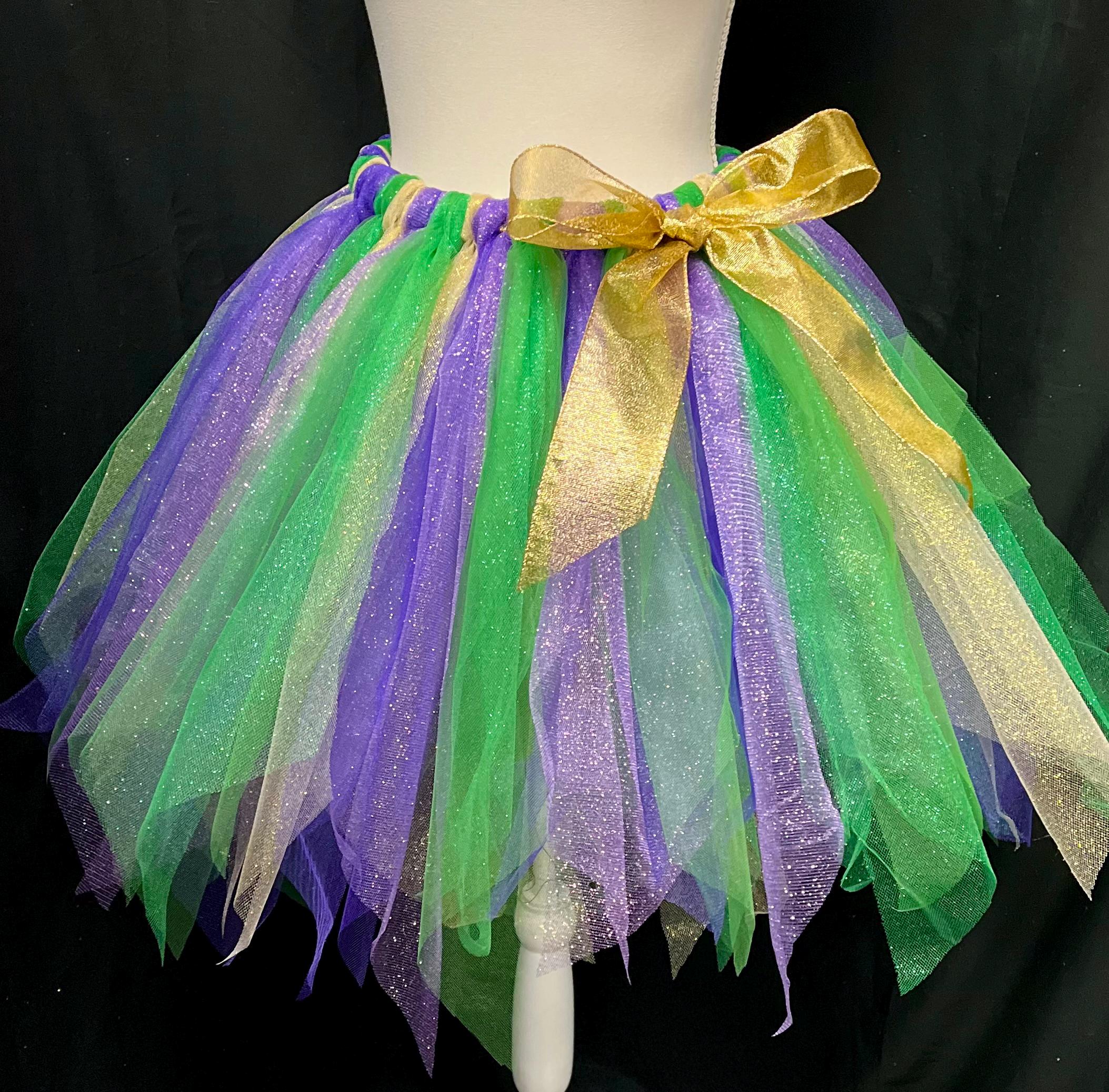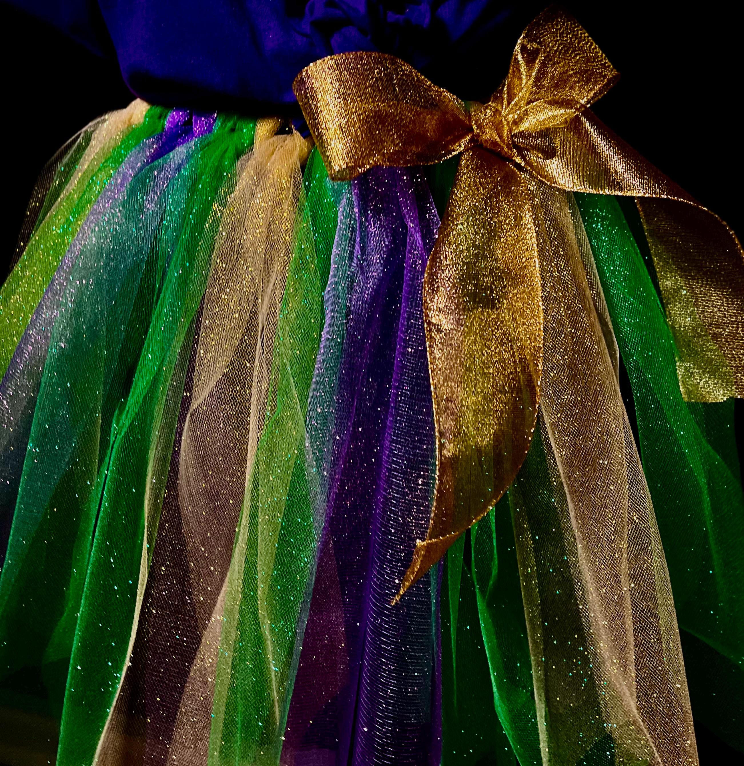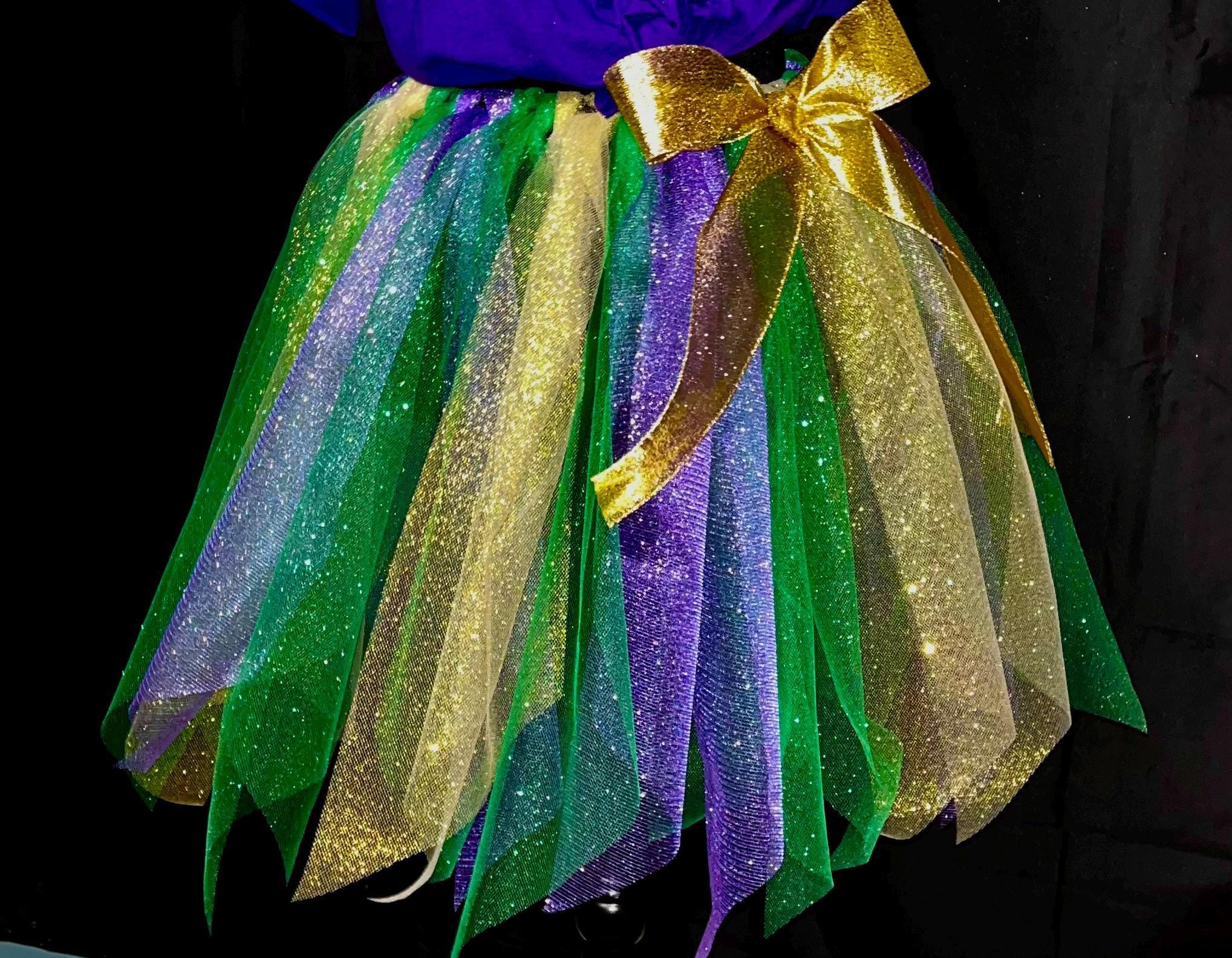 Yes , let the party begin with this adorable sparkly pointed cut , purple, green , and gold color tutu. Extra full . This Mardi Gras adult and teens tutus is Handmade from 100% Polyester fabric materials . Soft Comfortable 1 inch elastic waistband. Comes with a beautiful Matching bow, Lightweight and fun to wear.! You can request to rearrange colors to your liking as well. Leave a message for the seller in the message box included . Thanks in advance for your support!