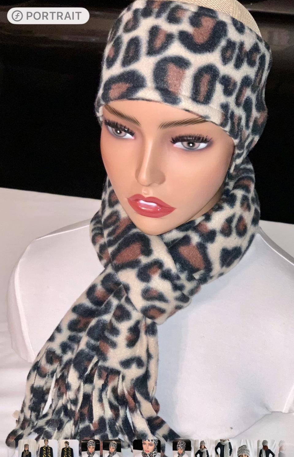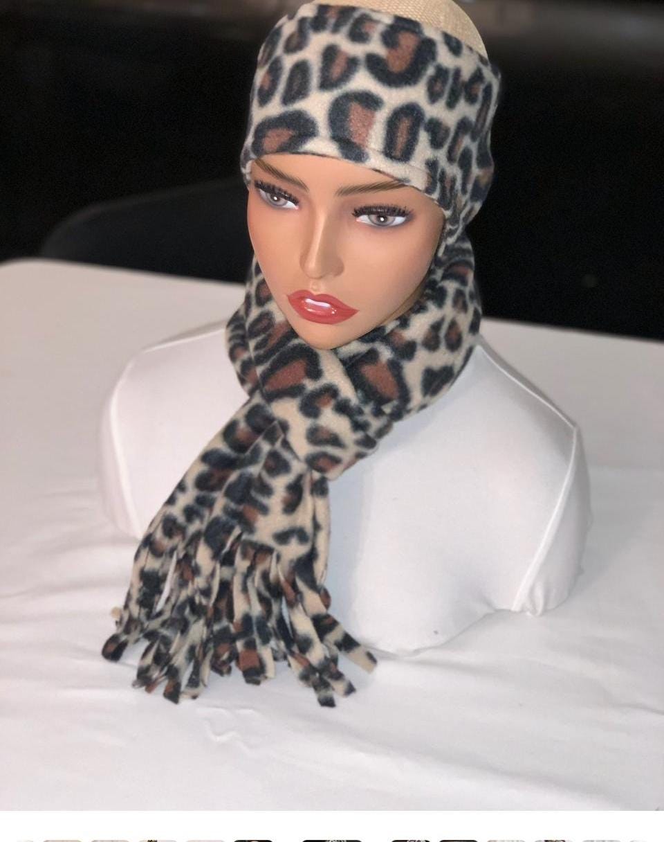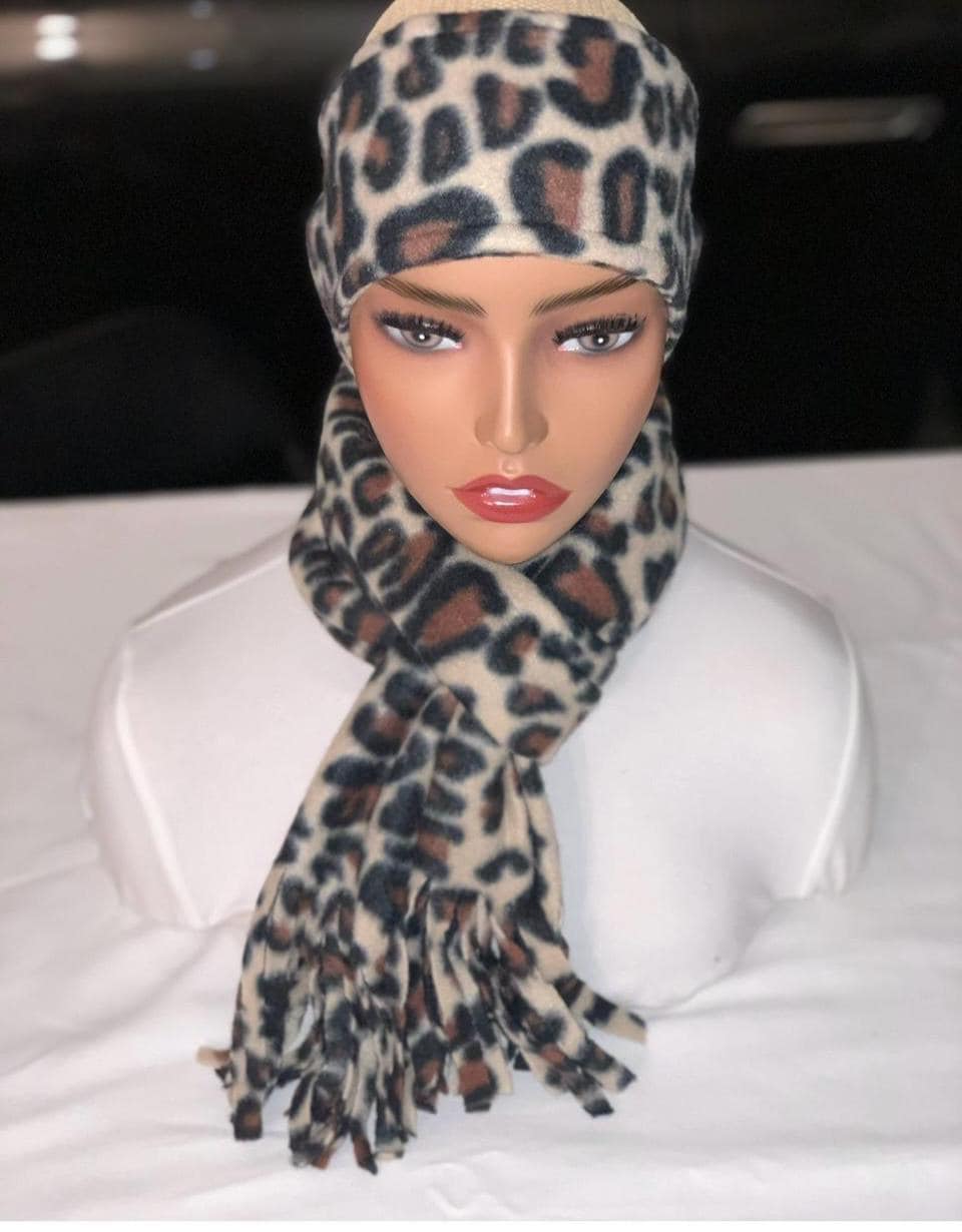 Leopard Fleece Printed set: Fringed Designer Scarf and ear warmer or hat set
